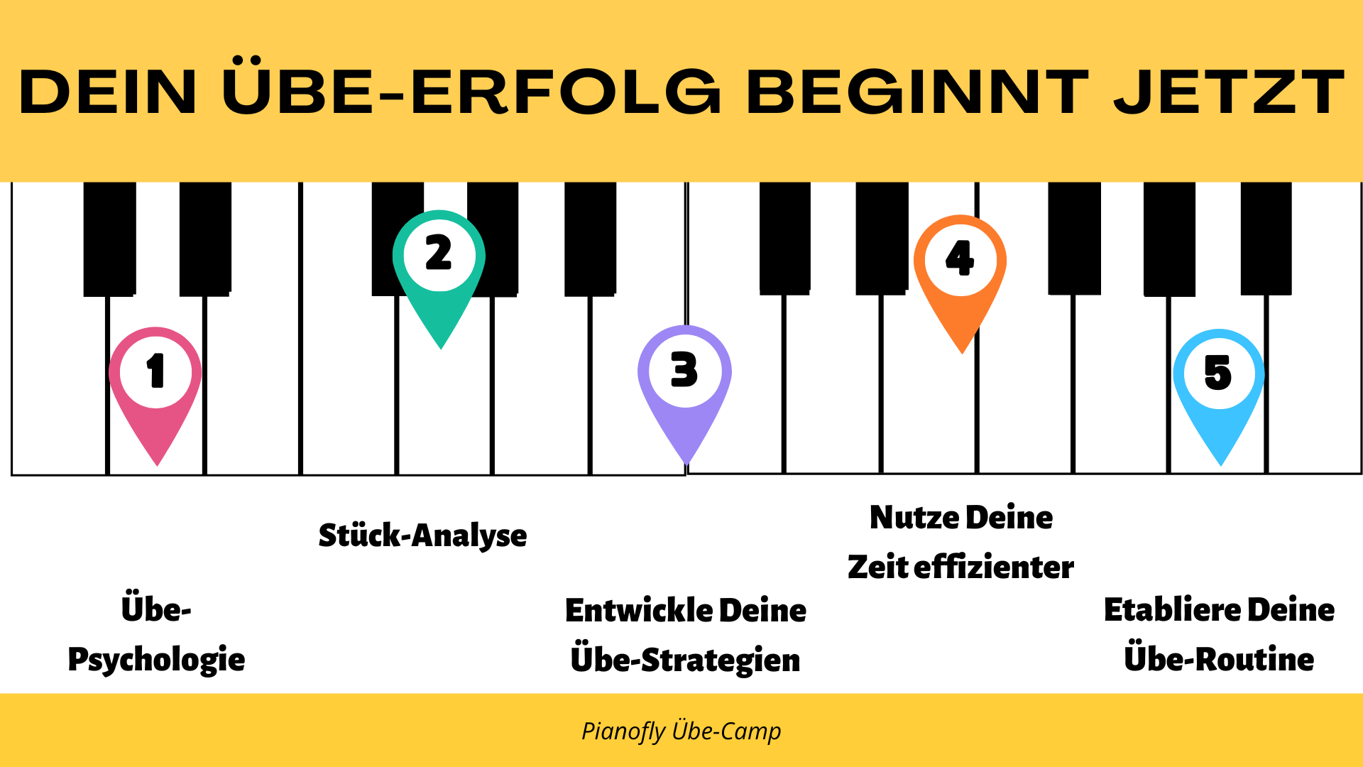 Regelmäßige Fortschritte und anhaltende Motivation sind das Ergebnis einer gesunden und ausgewogenen Übe-Routine. Bei vielen Klavierspielern wird der Alltag zum größten Feind, wenn es ums Thema Klavier üben geht. Wie Du Deinen Alltag zum Freund machst, besprechen wir in der finalen Woche. 💡